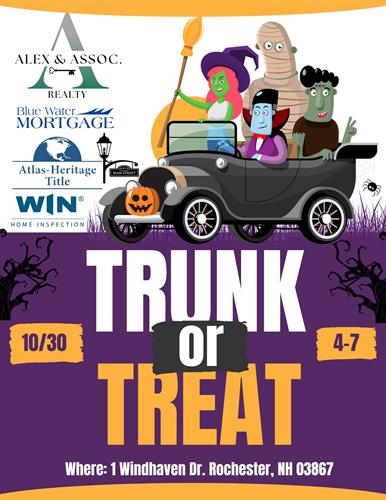 Join Alex & Associates Realty's 2nd annual trunk or treat event, along with some of our trusted affiliates, for a safe family trick-or-treat night at a one stop location!